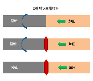 摩擦圧接は材料を回転させ、一定の圧力(摩擦圧)で押付け合うことで、接合面は摩擦熱により高温層となり、その後回転制止して強く加圧することで固相接合させる接合方法です。マグネシムとチタンなど異種金属の特性が必要な場合に使用します。主に自動車をはじめ、航空機、工作機械等の異種金属のシャフトの接合などに用いられていますが、薄板金属の接合の場合は、ツール先端に先端に突起を施したモノを回転させながら、重ね合わせた金属板に押し付け、突起部に接する金属板とに、摩擦熱を発生させて、その後ツールの回転を制止して加圧を行い固相で接合(摩擦攪拌接合)を行います。