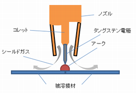 ティグ(アルゴン)溶接は、大気から溶接による金属の酸化を防ぐために、タングステン電極の周りからアルゴンガスやヘリウムガスなどの不活性ガスを放出し、ガスのシールドを作ります。シールドガスを流した状態で、融点の高いタングステンと被溶接物 との間にアーク放電を発生せしめ、そのとき発生 する熱で溶接します。電子の流出 するタングステンを冷却し、電子の流入する被溶接物の発熱を促進 するため、タングステン電極をマイナス、被溶 接物をプラスにするように直流電源に接続することによってタングステン電極のダメージを抑制 し、効率よく被溶接材(インコネル)を溶融することができます。![]()